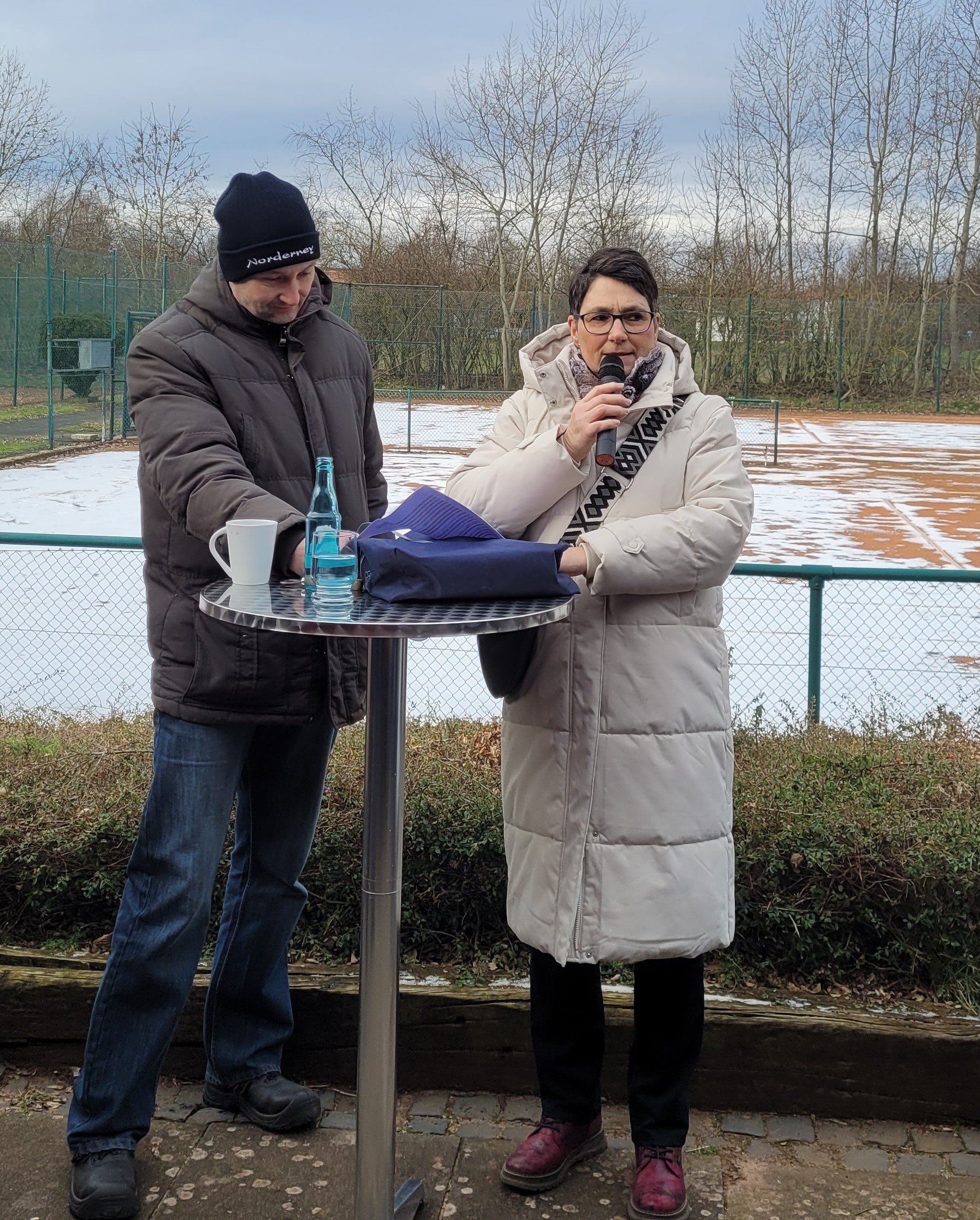 Neujahrsempfang der Vereine beim TV Stolzenau 150 Personen, so viel wie noch nie, hatten sich zu dem Neujahrsempfang der Vereine: VfB Stolzenau (Verein für Breitensport) , TV Stolzenau (Tennisverein) und Förderverein Freibad Stolzenau angemeldet. „Der Boden gefroren, der Himmel bedeckt es bleib aber trocken so machen sich über 100 Erwachsene und Kinder nach der Begrüßung des Vorbereitungsteams des TV Stolzenau auf den 1- stündigen Wanderweg. “ In diesem Jahr war der Tennisverein Stolzenau Ausrichter des Neujahrsempfanges der Vereine. Am Tennishaus angekommen war die Schlange am Glühwein- und Punschstand lang. Wilfried Falldorf begrüßte alle Gäste, gab eine Rückblick auf das vergangene Jahr, einen Ausblick auf 2024 und einen kurzen Hinweis auf das anstehende Jubiläum. Elisabeth Wiegmann berichtete von den Planungen für 2024 und von den zur Zeit stockenden Sanierungsmaßnahmen. Fest steht, dass es in 2024 eine (wenn auch kürzere) Badesaison gibt. Sie rief zu Pfandbonspenden zugunsten der Edelstahl-Breitrutsche beim Rewemarkt auf. Marion Hahn berichtet von der aktiven Jugendarbeit und einer wiedererstarkten Fußballsparte beim VfB und rief dazu auf, die Spiele regelmäßig zu besuchen. Sie ehrte für das Projekt Flutlichtanlage Kasten Hahn, Peter Herrmann, Bernd Mentze und Rudi Turzinski für deren großen ehrenamtlichen Einsatz. Als Ehrengäste waren in diesem Jahr Samtgemeindebürgermeister Jens Beckmeyer und Bürgermeister Heinrich Kruse anwesend, die von aktuellen Projekten in Stolzenau und der Samtgemeinde Mittelweser berichten. Beide wiesen auf eine Eröffnung des Freibades Stolzenau in diesem Jahr hin. Das kompetente Grillteam versorgte die Hungrigen perfekt. Nun war die Zeit für Gespräche